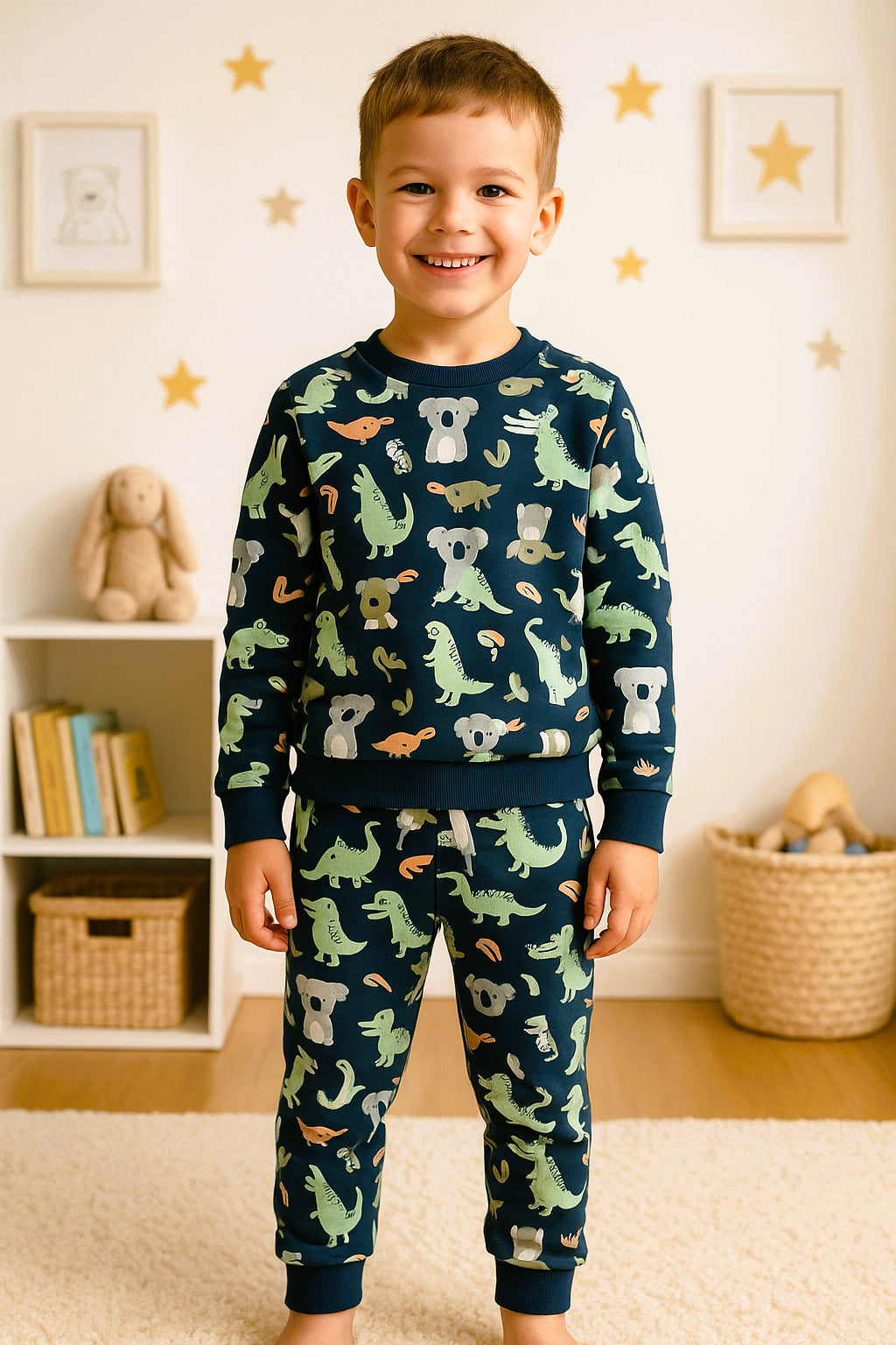 Front Open Full sleeves Cotton Tshirt with Pant (Green Blue Dino)