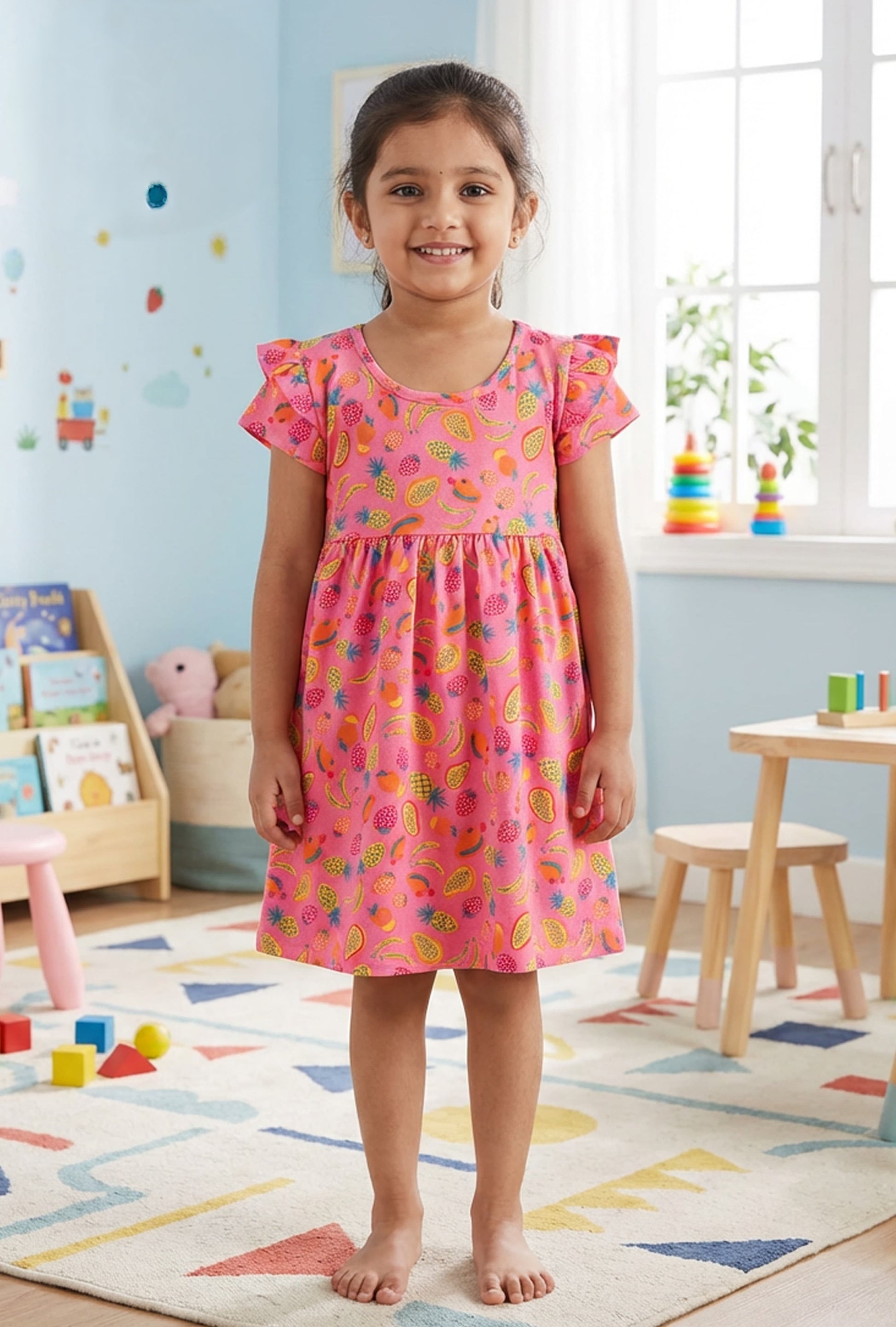 The pretty all-over print and flutter hand frills add a playful charm, making it ideal for outings, playtime, birthdays, and casual occasions.